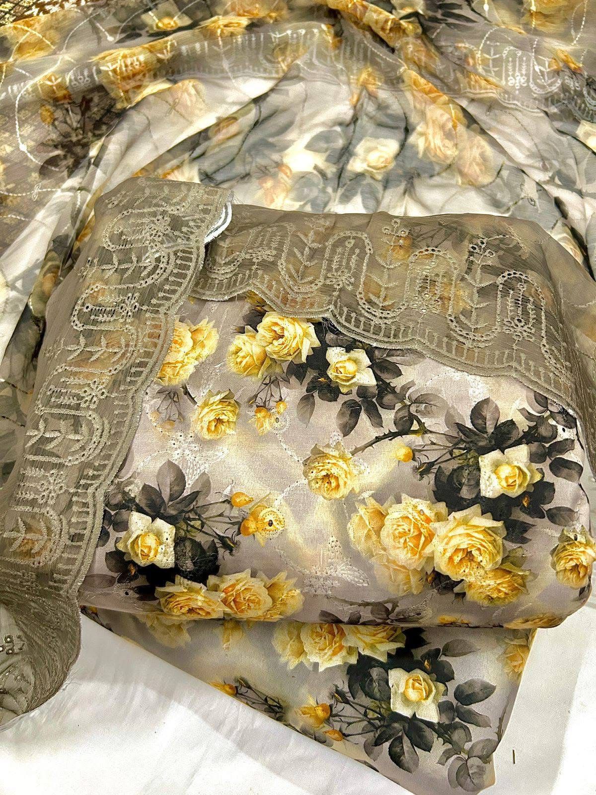 Chikan Kari 3-Pc Suit features a beautiful, floral design on soft fabric, showcasing intricate hand-embroidered Chikan work. The vibrant shades of pink, yellow, and white flowers stand out against a soothing turquoise background, adding a touch of elegance and tradition. The suit includes three pieces: a top, bottom, and matching dupatta, making it perfect for any festive occasion or casual outing. The delicate lace detailing along the edges enhances the overall look, creating a perfect blend of comfort and style.