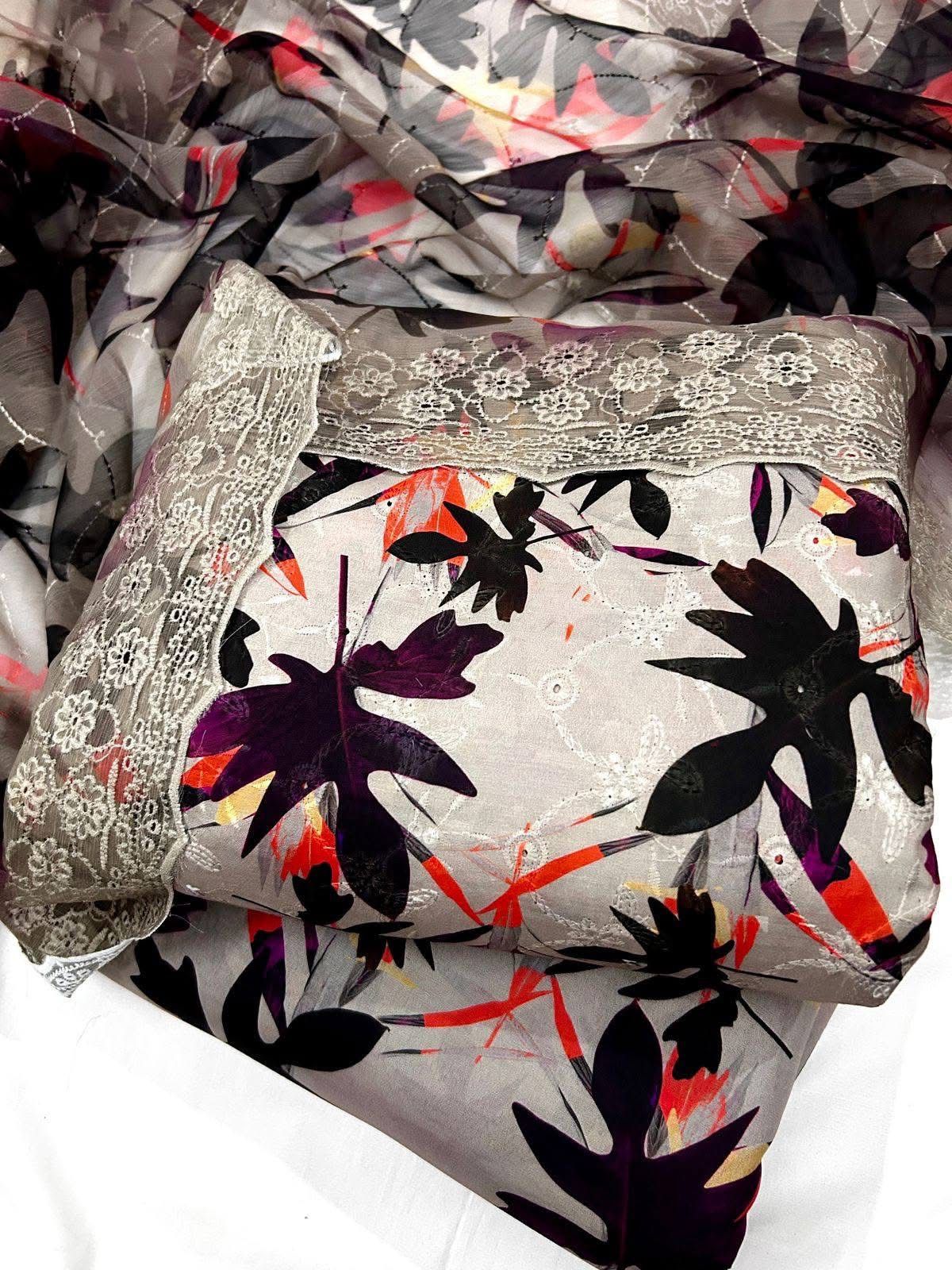 Chikan Kari 3-Pc Suit features a beautiful, floral design on soft fabric, showcasing intricate hand-embroidered Chikan work. The vibrant shades of pink, yellow, and white flowers stand out against a soothing turquoise background, adding a touch of elegance and tradition. The suit includes three pieces: a top, bottom, and matching dupatta, making it perfect for any festive occasion or casual outing. The delicate lace detailing along the edges enhances the overall look, creating a perfect blend of comfort and style.