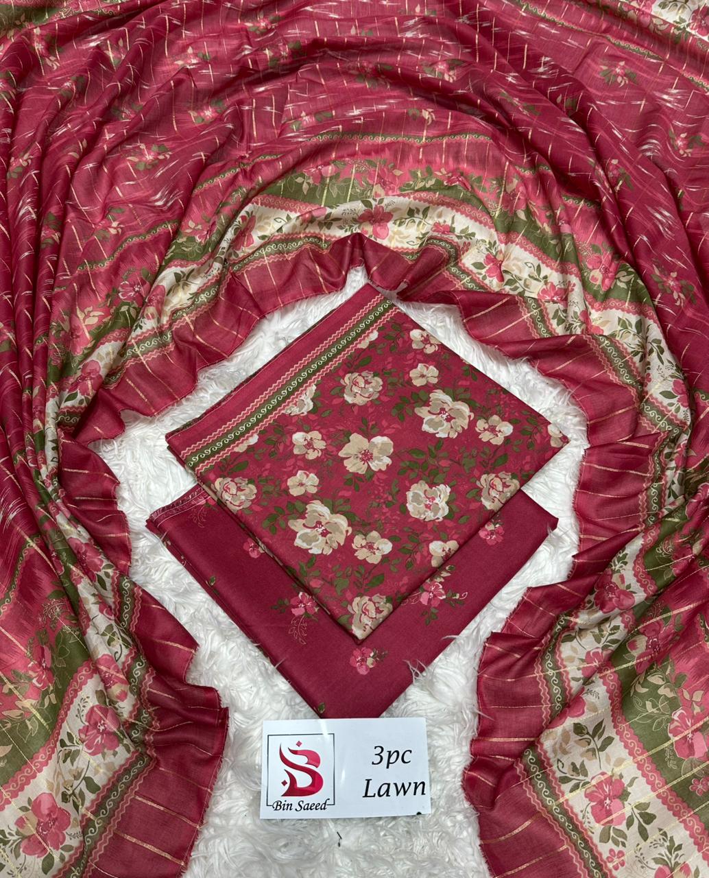 Elevate your summer wardrobe with this Printed Lawn 3 Piece Suit, featuring a breathable lawn shirt, matching trousers, and a coordinating dupatta. Adorned with vibrant prints and fine detailing, it offers lightweight comfort, graceful drape, and effortless elegance for daily wear and festive occasions in warm weather styling versatility assured.