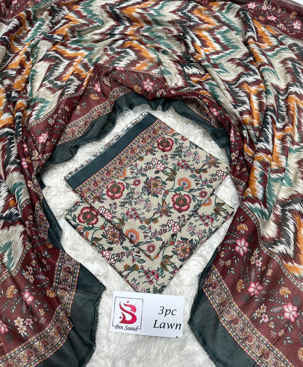 Elevate your summer wardrobe with this Printed Lawn 3 Piece Suit, featuring a breathable lawn shirt, matching trousers, and a coordinating dupatta. Adorned with vibrant prints and fine detailing, it offers lightweight comfort, graceful drape, and effortless elegance for daily wear and festive occasions in warm weather styling versatility assured.